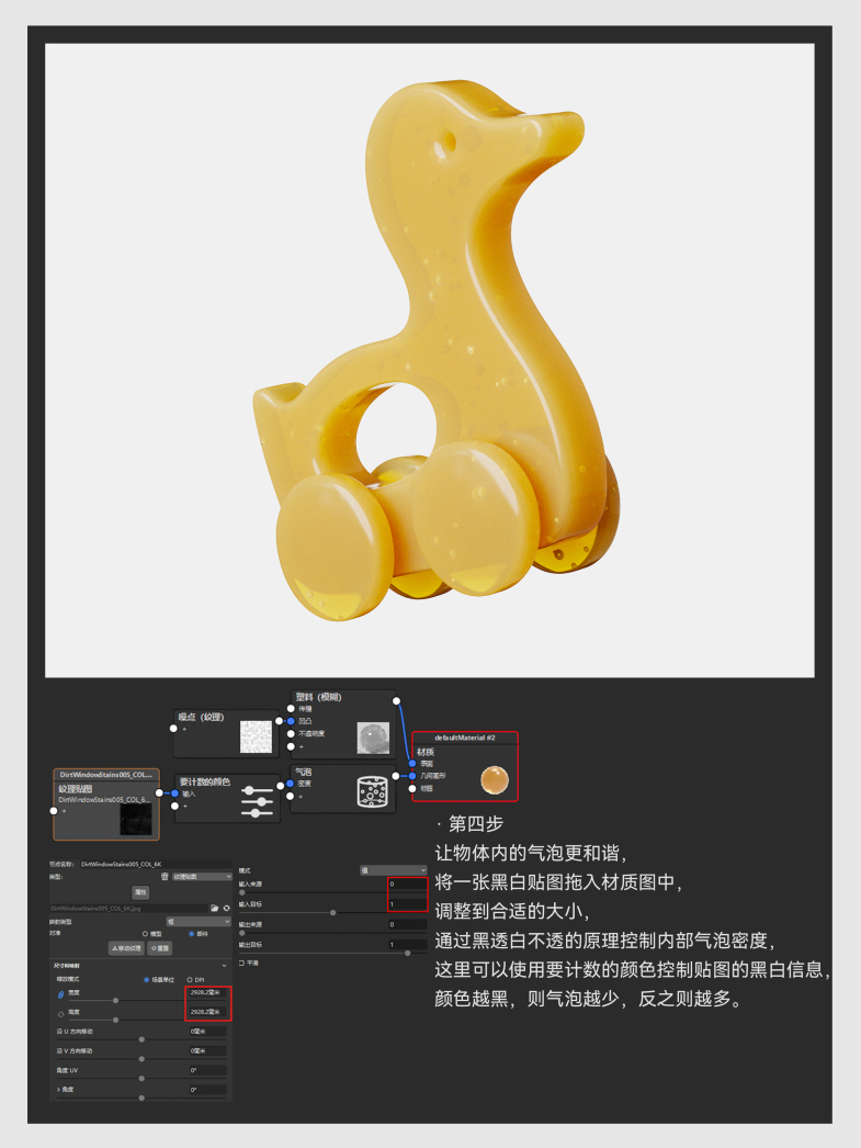 让物体内的气泡更和谐,将一张黑白贴图拖入材质图中,调整到合适的大小,通过黑透白不透的原理控制内部气泡密度,这里可以使用要计数的颜色控制贴图的黑白信息颜色越黑,则气泡越少,反之则越多。