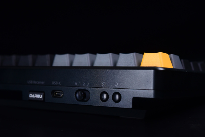 键盘左上方集成了一堆控制按键和无线接收器的收纳仓。也许是为了美观,连接模式切换按键的档位有点短,比较容易过位;而另外两颗圆形按键则是RGB拾音灯带的模式和颜色切换按键。
