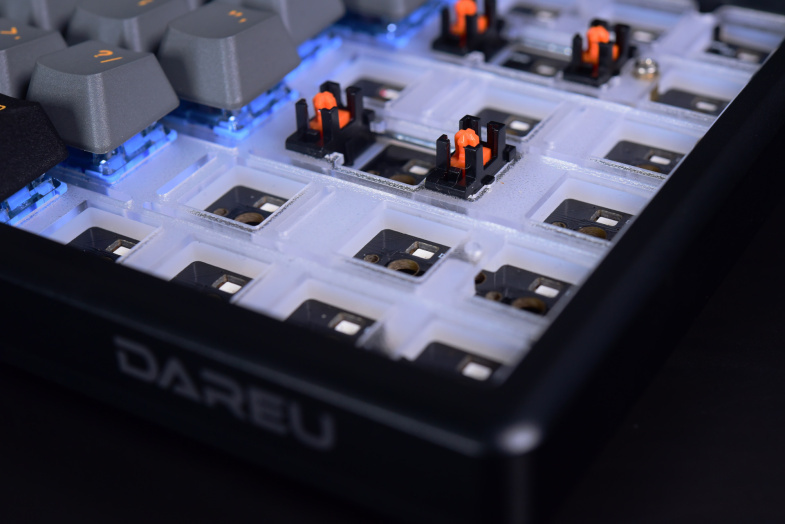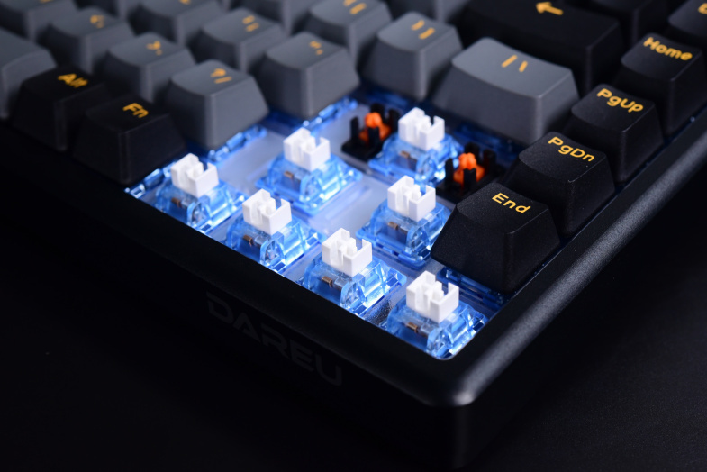 轴体方面采用的是达尔优自家的定制轴天空轴V3,达尔优天空轴的轻盈线性手感一直口碑不错,而V3版本升级了轴芯结构,下压过程更稳定。在后续出的A系列机械键盘中这个轴非常常见。