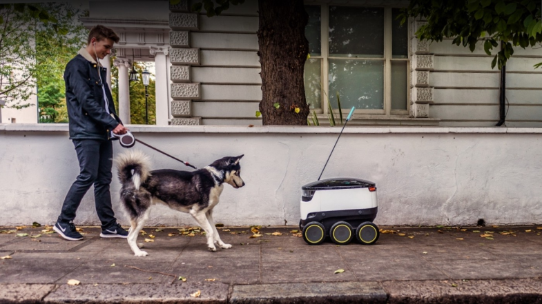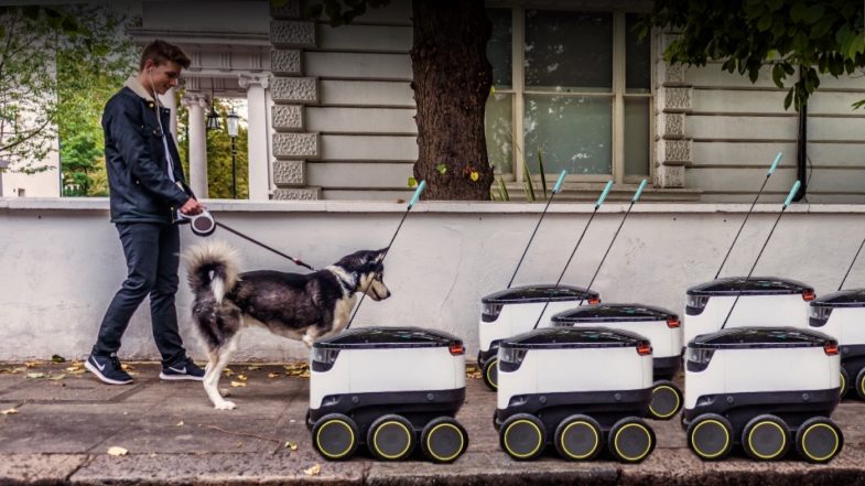 以Starship送货机器人为例,上图是该公司的宣传照片:一个人(看上去很开心)和他的狗(看上去很好奇)在人行道上遇到一个机器人。我们可以把这张图理解为早期阶段的一个预想结果,这看上去很美好。但如果我们将时间点继续往后推,如果送货机器人成为了常态,那这会发生什么?