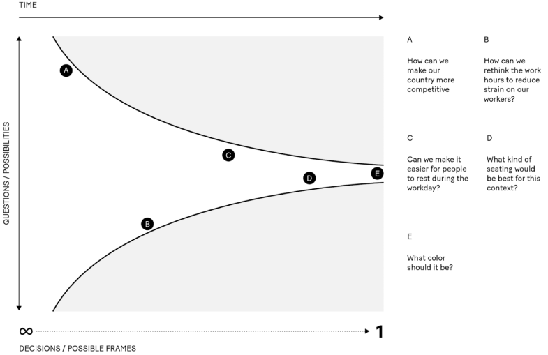 在狭窄的漏斗末端是传统的设计:这个区域里的设计师很乐意不问问题,他们从上游接收需求,并针对这些需求设计一个有创意的解决方案。