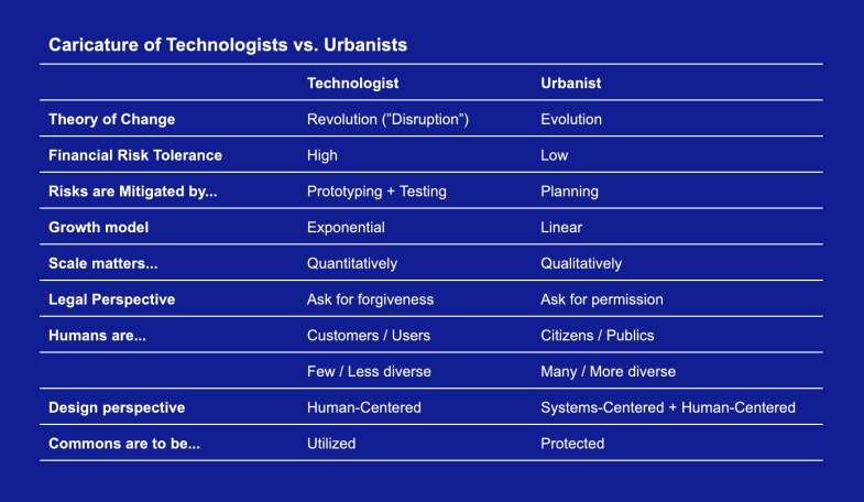 Ron所描述的花费时间和金钱或破坏信任的后果在我们专注于城市技术设计时更为重要。一个音乐app辜负了你的信任,你可以换一个应用。但如果机器人在你的人行道上侵占了你使用人行道的权力,那么这造成了完全不同的伤害,App Store没有办法给你提供新的人行道。