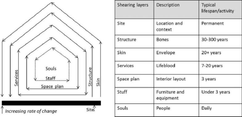 剪切层[6] 将建筑物视为一组在不同时间范围内演变的组件。弗兰克·达菲(Frank Duffy)用他的话概括了这种观点:“根本就没有建筑这种东西。一座构思合理的建筑是由几层经久耐用的建筑组件组成的。”因此,需要根据不同组件的更新频率来设计他们的耐久性。