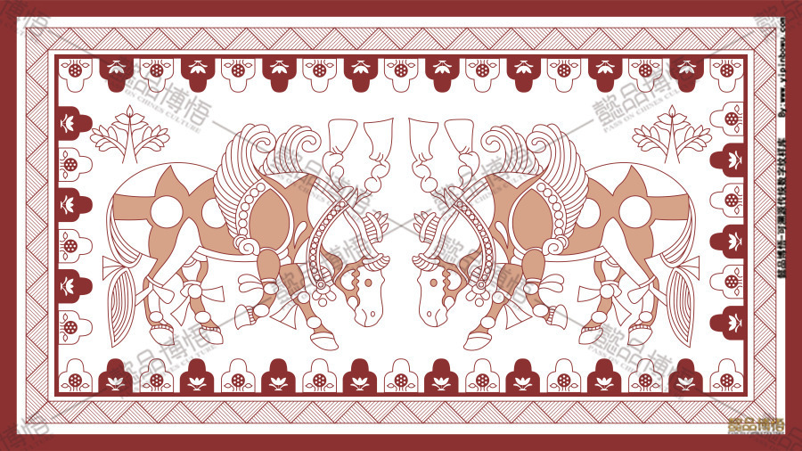 采用唐朝时期锦上的飞马饮水纹为灵感来源。整幅纹样以飞马饮水纹形成一幅作品,有着活力、健硕、灵感、吉祥、上善若水的寓意。
