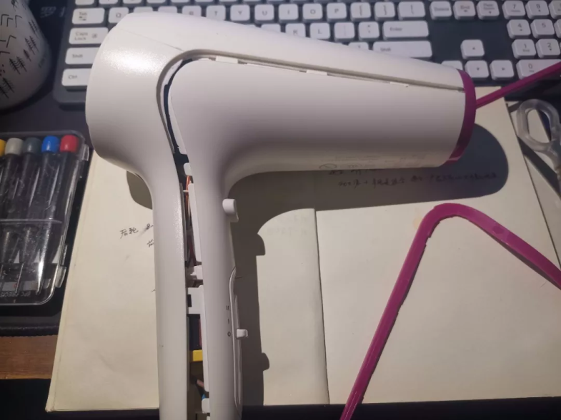 基于这个前提,如果是左右或上下分模型,切开了进出风口的圆筒,那整支电吹风运行过程中就很容易出现漏风问题,这是设计上的缺陷。