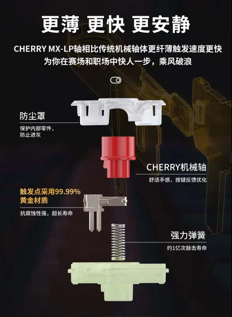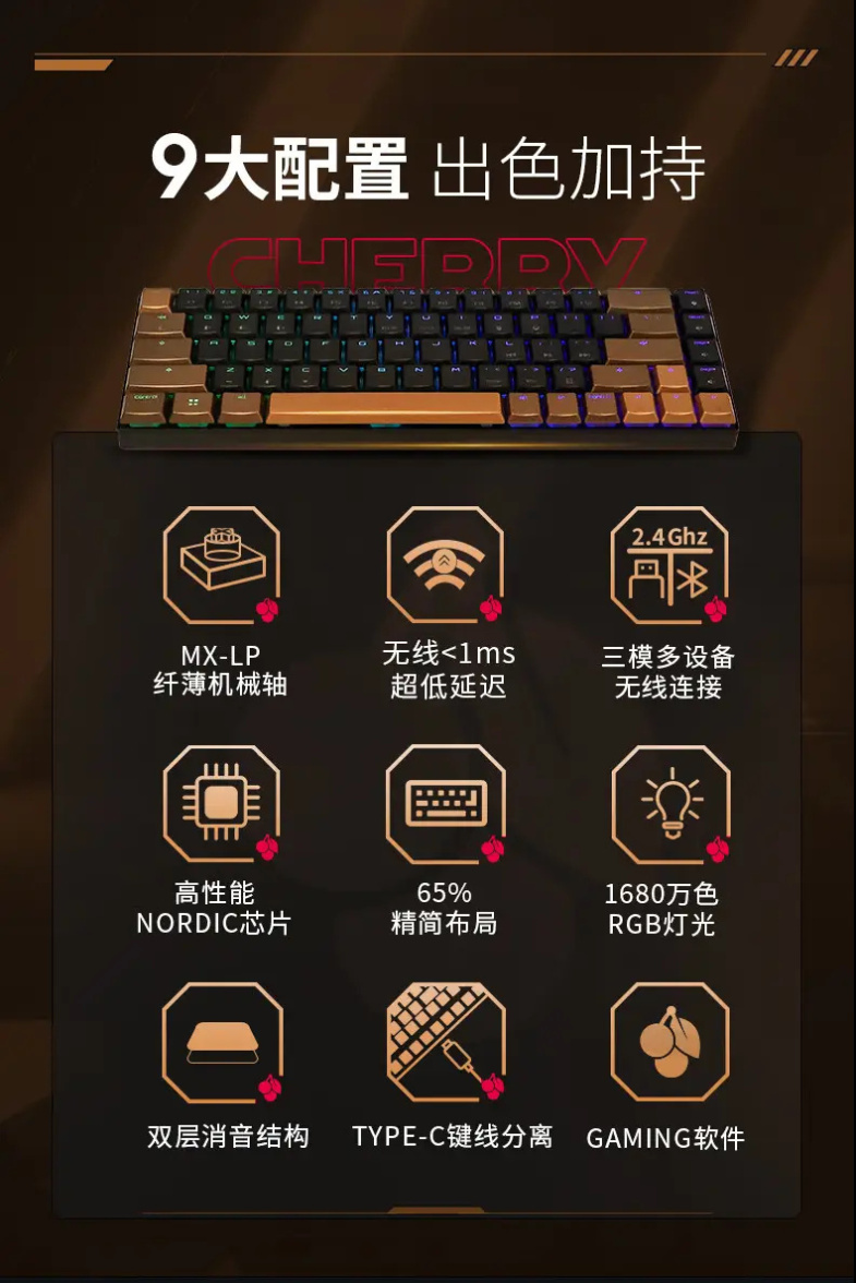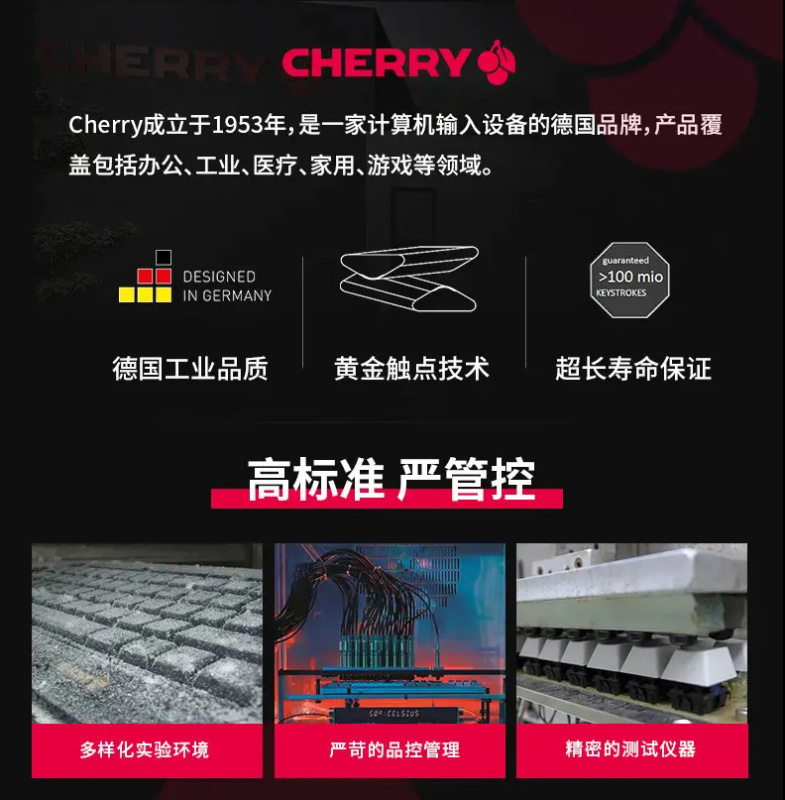 Cherry是德国全球数一数二的专业键盘制造厂商。成立于1965年,一家德国公司,主要从事生产电脑周边键盘以及Switch(轴),以独殊的手感和黄金触点使其品质倍增,让品牌闻名天下。