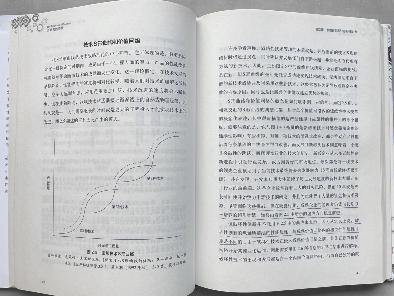 这是一本管理类图书,相对比较复杂一点,我就直接复制这本书的官方介绍了:“管理大师克里斯坦森指出,一些看似很完美的商业动作——对主流客户所需、赢利能力最强的产品进行精准投资和技术研发——最终却很可能毁掉一家优秀的企业。他分析了计算机、汽车、钢铁等多个行业的创新模式,发现正是那些暂时遭到主流客户拒绝的关键的、突破性的技术,逐渐演变成了主导新市场的“破坏性创新”。如果企业过于注重客户当下的需求,就会导致创新能力下降,从而无法开拓新市场,常常在不经意间与宝贵机遇失之交臂。而更灵活、更具创业精神的企业则能立足创新,把握产业增长的下一波浪潮。”