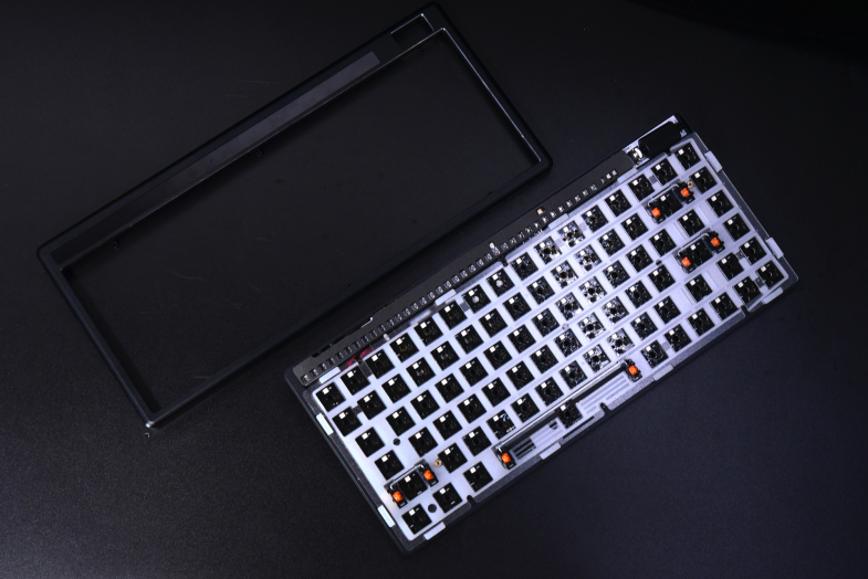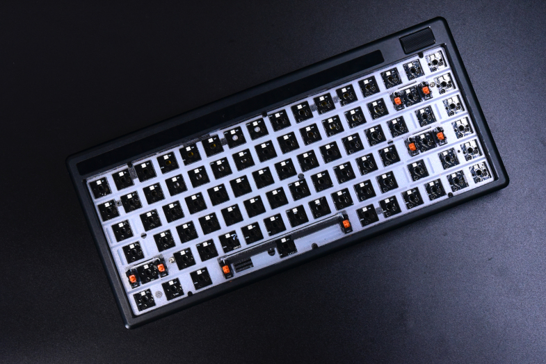 键盘上下盖的固定螺丝都藏在内部,需要把键帽和轴体都拆卸后才能看到,定位板边缘有6颗固定上下盖的螺丝。