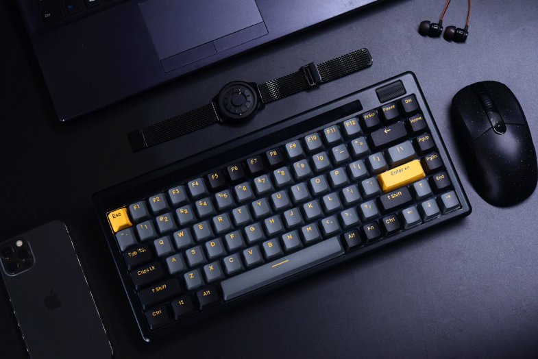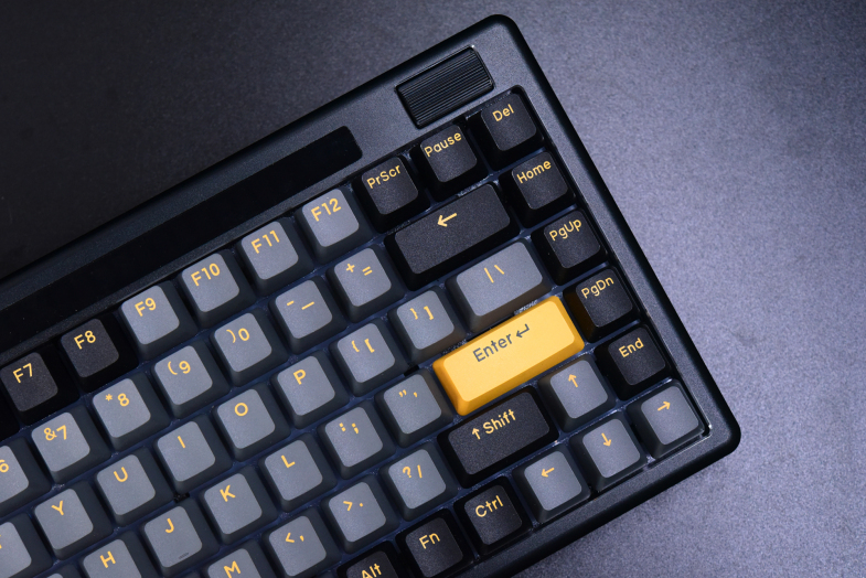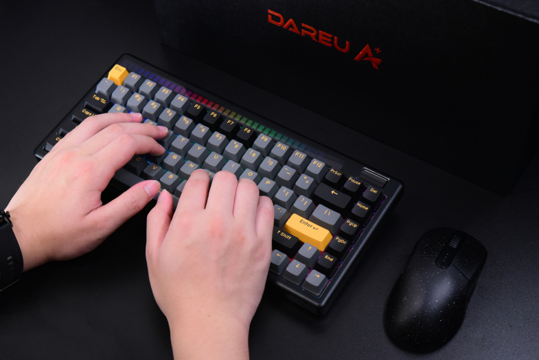 达尔优A84 Pro的外观配色有烈焰红、白桃粉和我手上的沉石金。沉石金的配色方案是三款里面最稳的,黑色主调的上下盖比较百搭,而且金属外壳加持显得很有高级感。