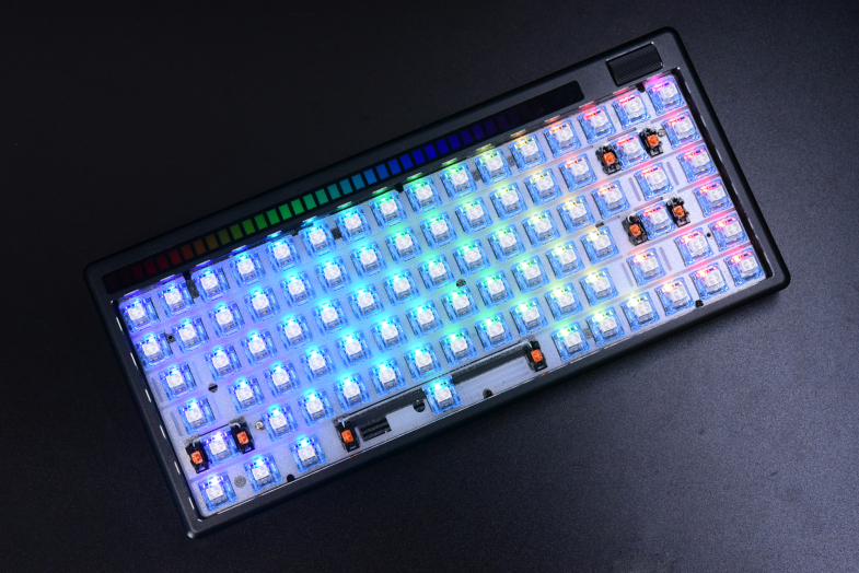 无线状态下,适应灯带和按键灯珠的灯光都能直接拉满,而且国产灯厂的灯效和过渡都很不错,要想让键盘灯光更炫的话,可以换一套透光的键帽。