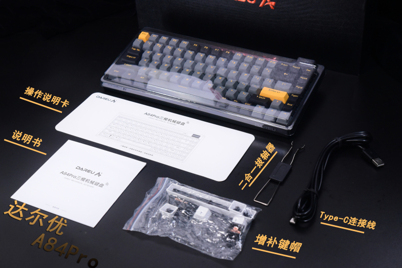 打开包装后,我们可以看到盖着防尘盖和塑膜包裹的A84 Pro键盘机身,还附带了说明书和简易说明卡片,实用的硬件配件有拔轴器和增补键帽,键线分离设计的Type-C连接线,配件方面没多大惊喜,比较普通。