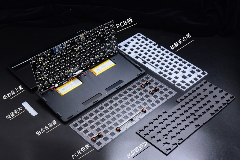 拆开后我们能完整看到了达尔优A84 Pro的整体结构,结构内的每一层都是平铺填满的,而且堆叠的层数很多,能填满上下盖之间的空间,实现去空腔化提升键轴稳定性,在结构方面A84 Pro的内部结构的确是实在得没话说的。