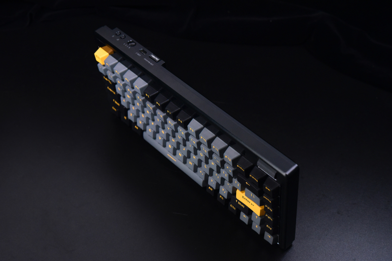 键盘的机身较厚,左上角集成了连接模式切换、拾音灯带模式/颜色切换、Type-C结构、USB收纳仓。