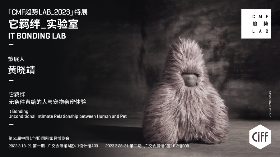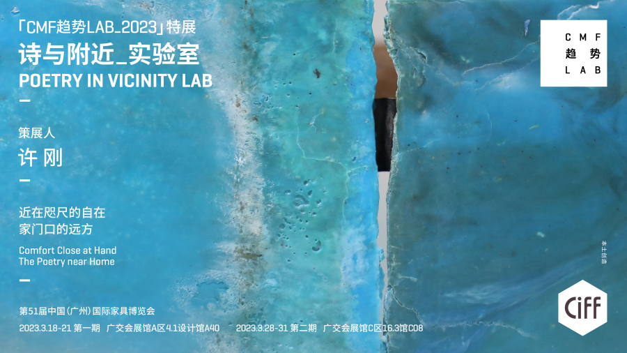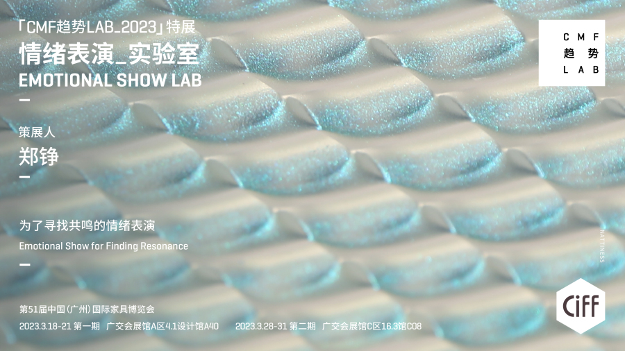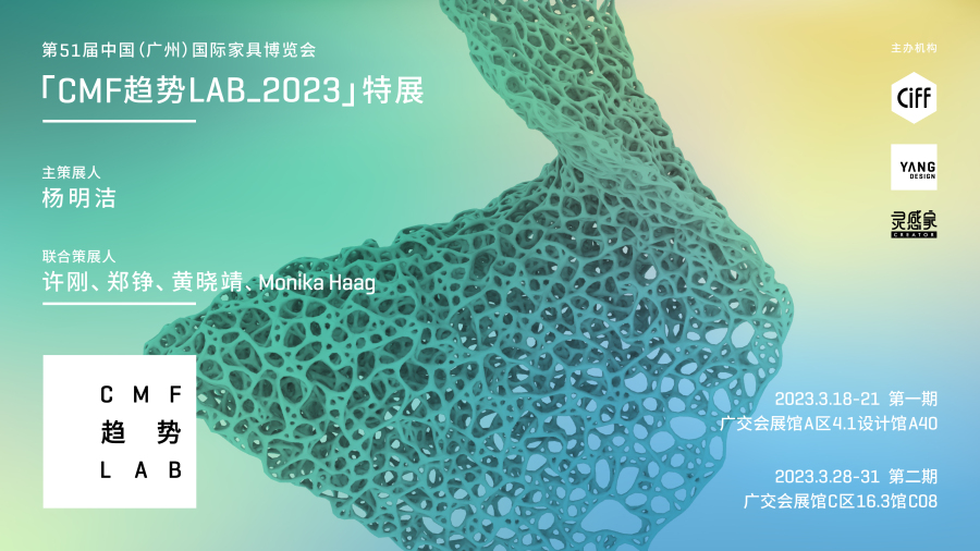 为更好赋能大家居行业上下游、呈现全链条的材料研究、让展商观众更充分地交流沟通,本届「CMF趋势LAB_2023」特展将在中国家博会(广州)民用家具展、办公商用及设备配料展均设置展区,即2023年3月18-21日、3月28-31日在广州·琶洲·广交会展馆均可参与这场材料设计盛宴!两个展期预计将带来超过500件聚焦CMF设计创新的展品。