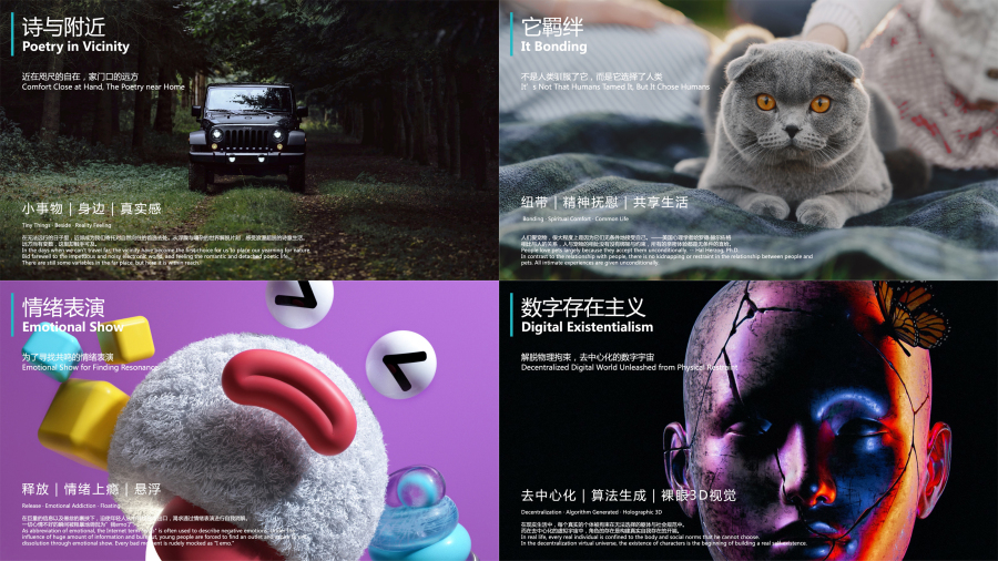 基于CMF成为“它物”最直观的外在表现,以“治愈”、“躺平”、“迷茫暧昧”、“民族自豪”四个维度,探讨如何以人性化的表情来触动消费者心灵情感。