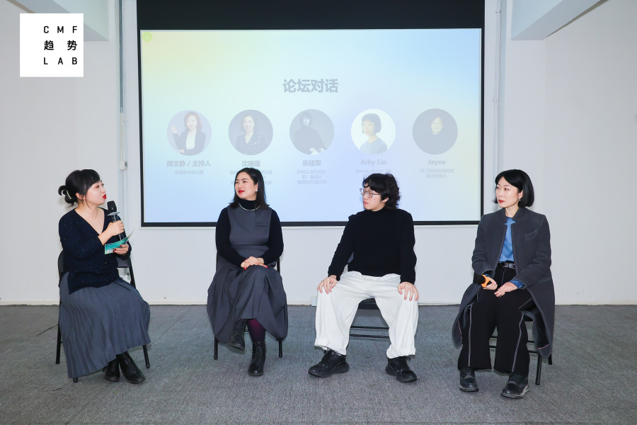 每一届「CMF趋势LAB」特展,都吸引力大量创新设计首发以及行业设计师的关注,在本次发布会上,德硅·雷诺丽特品牌总监沈晓莲女士、OWLS DESIGN 耶!猫设计 首席执行官乐建军先生、pawup design lab联合创始人Arky Lin女士等,多位来自创新材料研发及应用领域的“先行者”也分享了各自对CMF趋势创新的畅想。