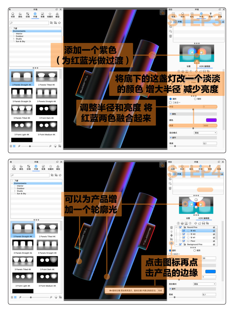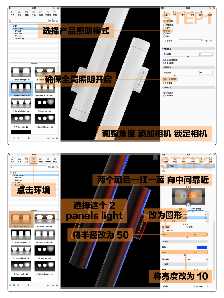 🟠 首先打开keyshot,打开产品照明模式,开启全局光照,调整合适的角度,添加相机再锁定相机。(因为需要点击产品表面改变灯光照射位置,所以锁定相机避免移动位置)然后点击环境添加一个两光源场景(2 panels light),将两盏灯改为一蓝一红,选择圆形即可调整半径和亮度。(半径改为50,亮度改为10)将两盏灯靠近中间位置移动。然后添加一个紫色作为过渡(点击大头针添加光源,并移送至红蓝灯之间)调整半径亮度,让红蓝光融合的更自然。点击下方的灯,改一个比较淡的颜色增大半径,减少亮度)最后可以为产品增加一个轮廓光(颜色偏亮),添加灯源后点击图标,点击产品的边缘即可。