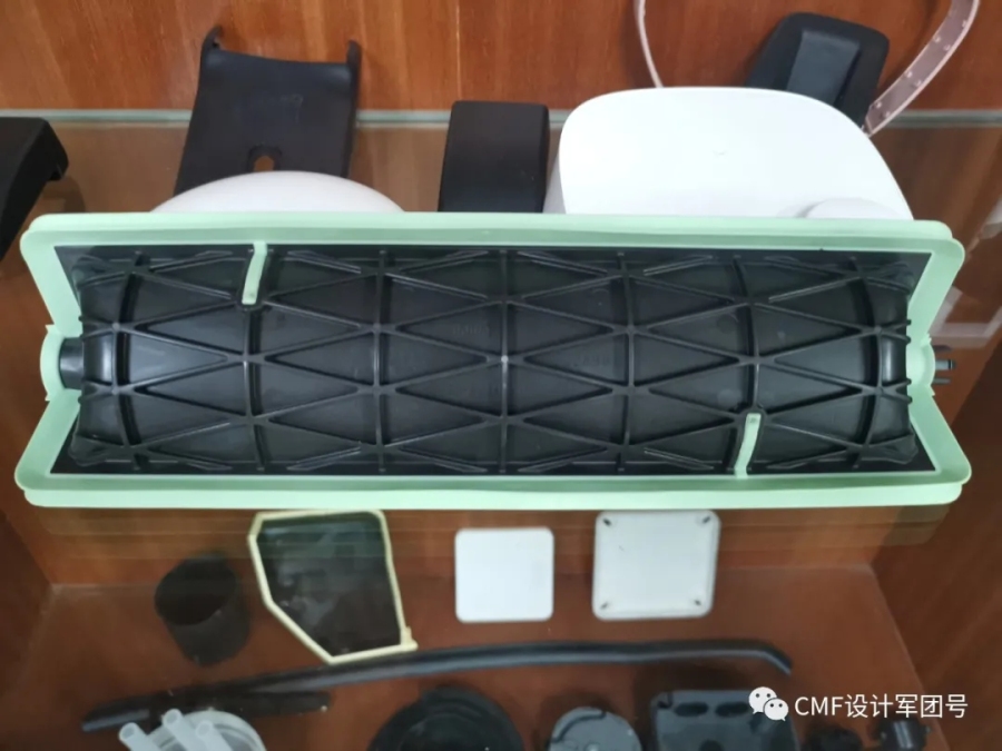 而随着产品设计及工艺技术的不断发展,仅是双色已经无法满足了。 如何将柔软的触感、多种色彩效果、LOGO、电子器件及美观的造型设计相结合?传统的注塑件组装过于繁琐,三色及多色注塑一体成型技术便应运而生了! 这个要划重点!CMF设计师及产品开发人员要重点了解。这是一种用于 多种材料的注塑成型工艺,可以有多种组合方式,比如塑胶+塑胶;塑胶+硅胶;塑胶+布料等,不仅可以实现色彩的多种组合应用,同时还可以通过植入相应的五金件,电子芯片等内部元器件,进而实现多功能性的集成,极大地减少组装工序,节省产品制作成本。 真正实现小型化、智能化、多功能、个性化的特点,在小区域功能的精密注塑产品领域具有独特的优势。