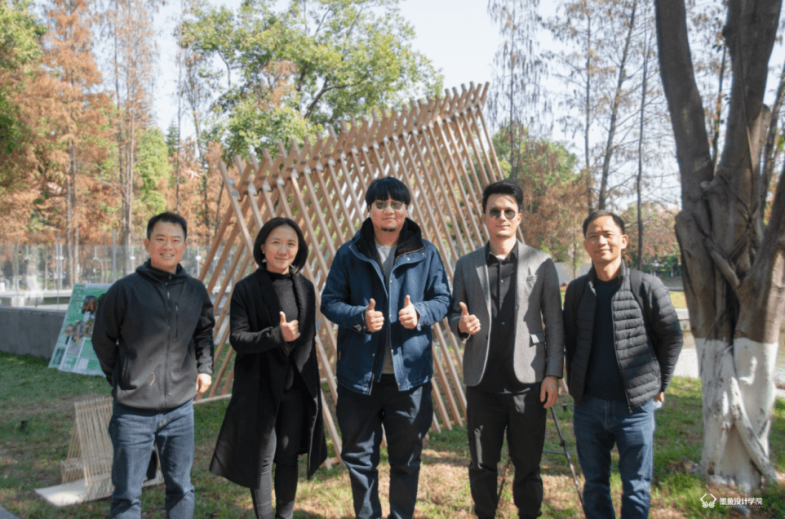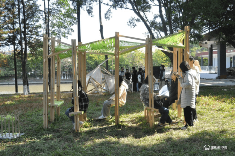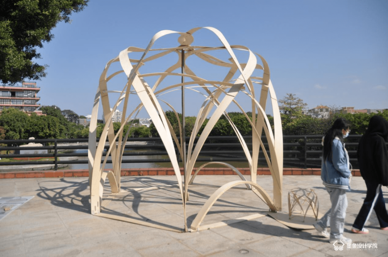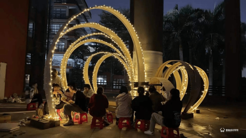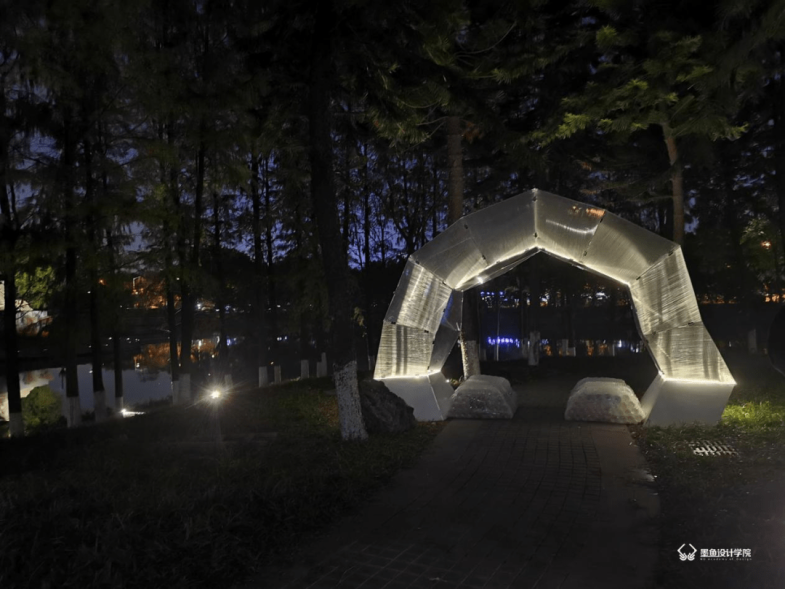 夜幕降临,华灯初上,同学们悄悄开启了作品的灯光。在一片寂静中,设计作品矗立在林间、在湖边,宛如开启未来世界的时光通道,静静等待着人们的到来。