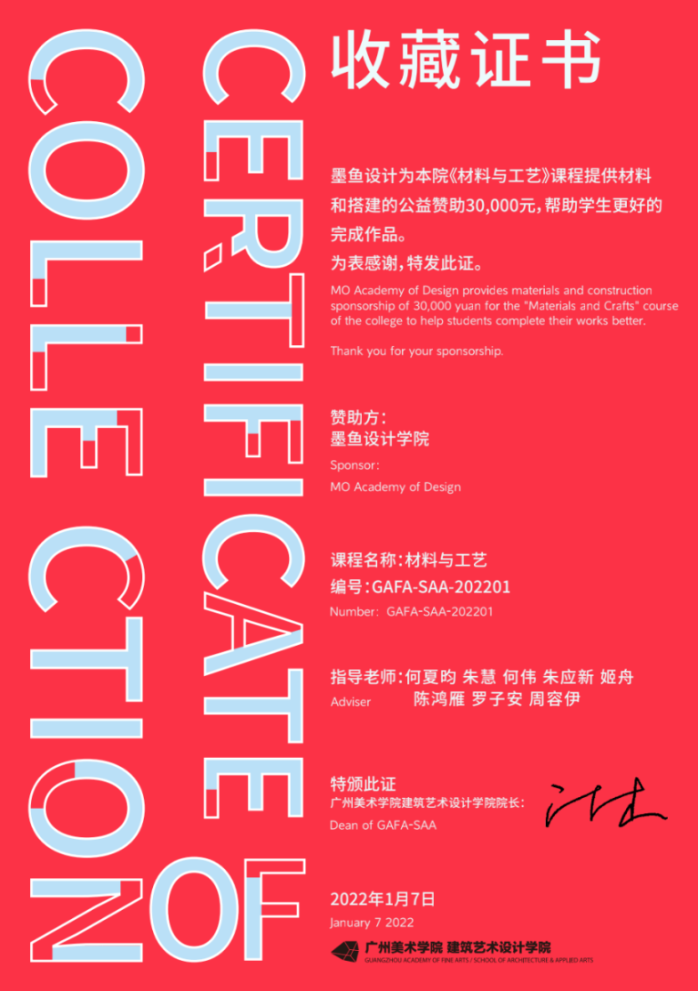 广州美术学院建筑艺术设计学院为墨鱼设计学院颁发感谢证书
