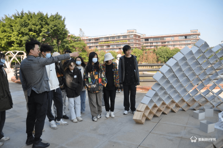 “还有哪里需要改的呢?”涂涂老师细致耐心地分享了自己从材料到设计的想法。而同学们则认真听取老师的建议,并不时低头记笔记,相信在这次作品展示中大家都受益匪浅。“好的先生不是教书,不是教学生,乃是教学生学”。亦师亦友,涂涂老师像大朋友一样亲切地和同学们交流实践经验。