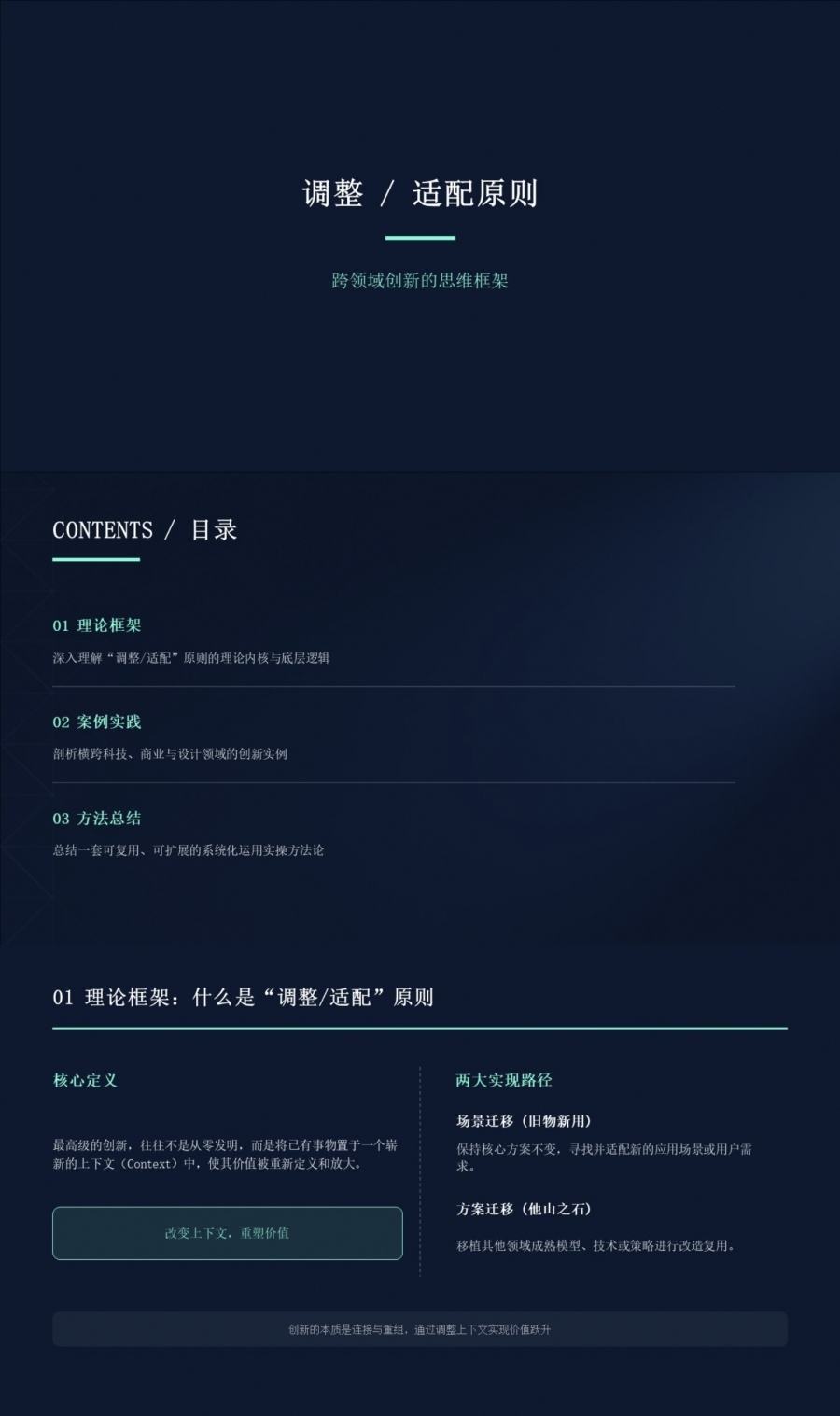 创造力,从来不是凭空出现的魔法。它更像是一种高级的“连接”与“重组”能力。这套“调整/适配”框架,就是为你装备了一副特制的透镜和一张无限延伸的连接网络,让你能看穿事物的本质,并在似乎毫不相关的领域之间,架起一座产生奇效的桥梁。