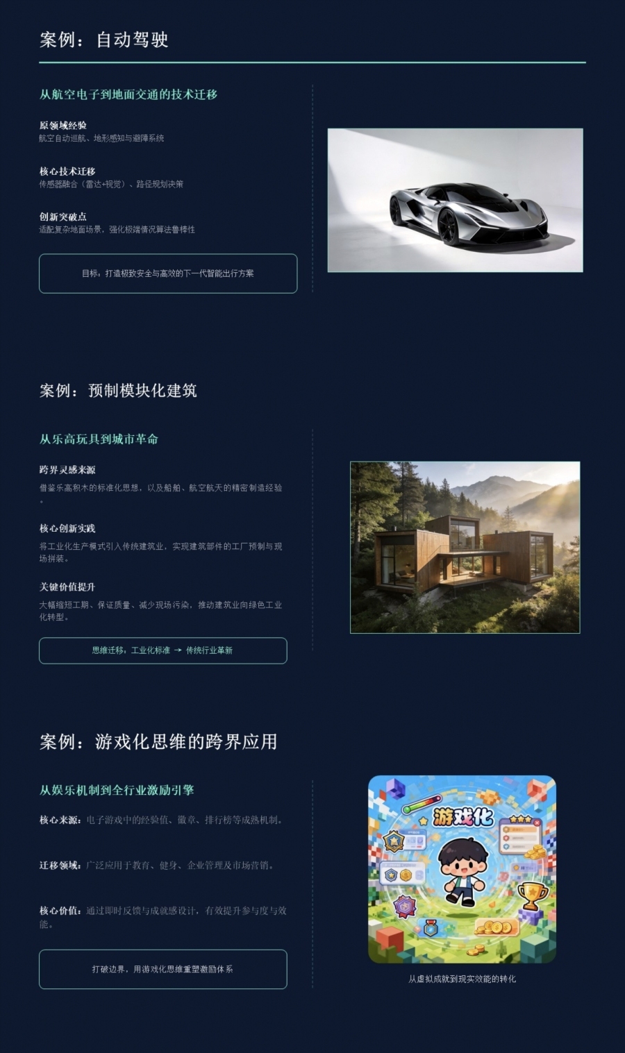 这样的例子不胜枚举:飞机自动驾驶的逻辑经过极端复杂化的适配,正在重塑地面交通;乐高积木般的模块化思维,被引入建筑界,掀起建造革命;游戏里让人沉迷的即时反馈与成就系统,被抽取出来,适配进教育、健身与企业管理,成为强大的动力引擎……