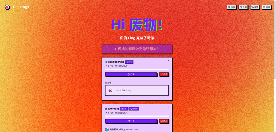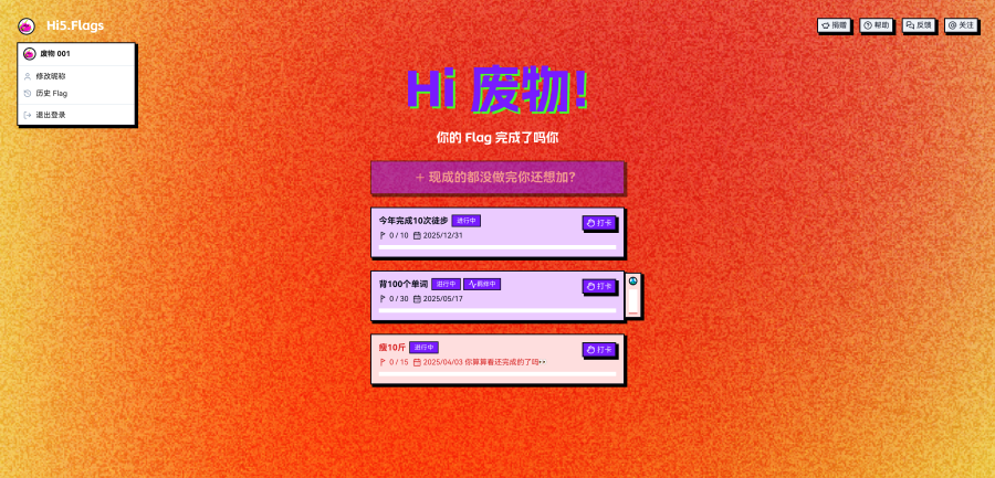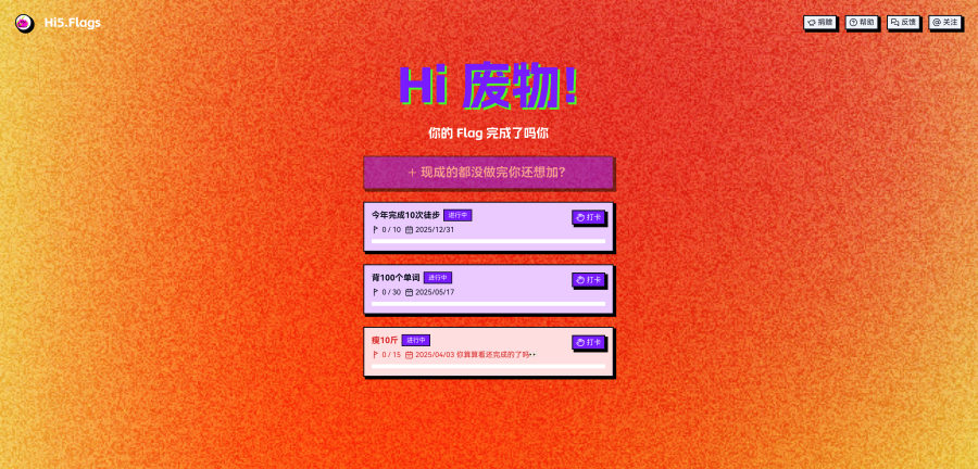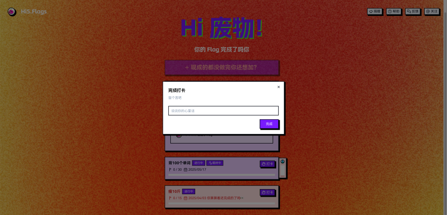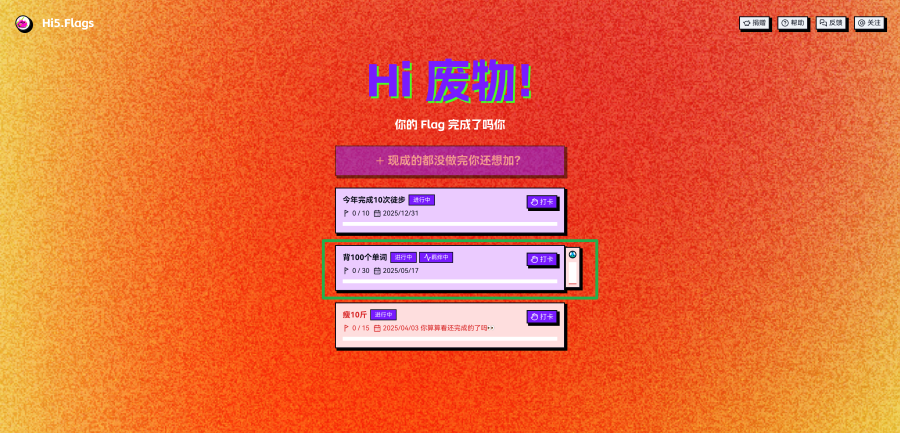 你可以点击『打卡』将你的Flag进度+1。但记住每天只能进行一次打卡。当打完所有的卡后,Flag就会自动完成啦。