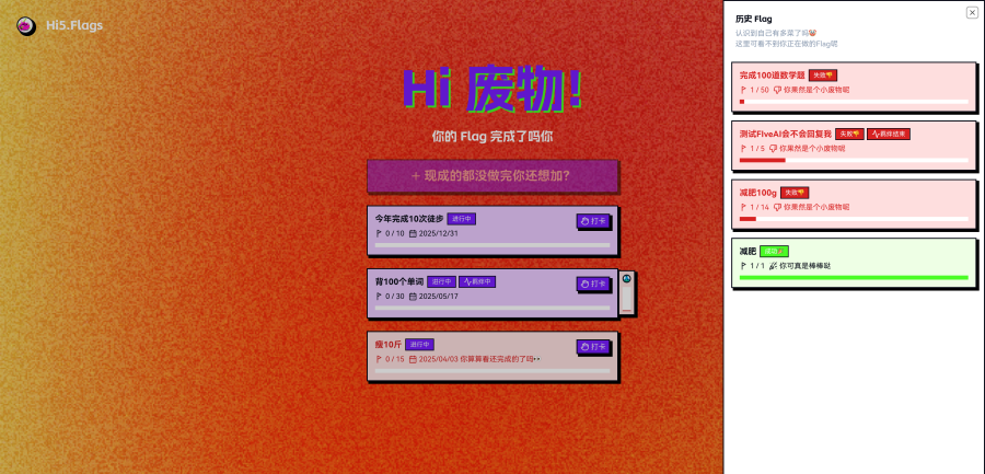 Hi5.Flag 不仅仅是一款目标管理工具,它是一种生活态度——敢于直面自己的不足,在嘲讽与自嘲中寻找改变的动力。