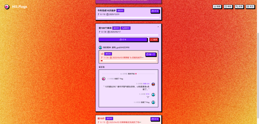 在Flag详情中你会看到留言墙。留言墙里有你、搭子和AI之间的亲(贴)切(脸)鼓(嘲)励(讽)。