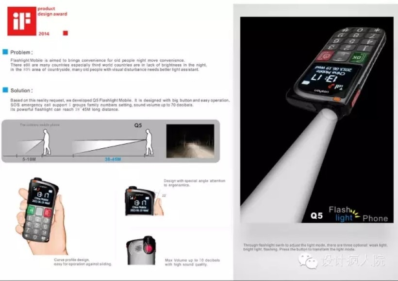 现在在京东众筹火热的老人产品,也是我第一款获得国际奖项的产品,2014年IF奖,流线的设计是基于手电功能的握感进行的变化,手电筒是与飞利浦合作进行设计,突破了现在同样小尺寸下,手电照的最远的距离(夜晚50-80米),而且解决了发热和使用持续能力,已申请和结构和外观专利。