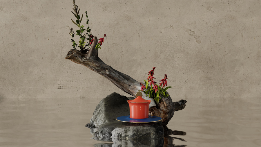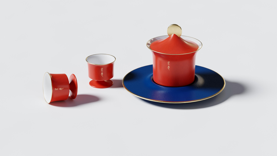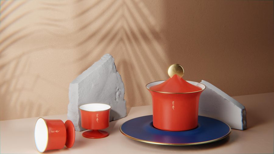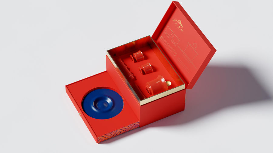 水月金沙三才盖碗套装,以盖碗为设计载体,结合当地饮茶文化,令盖碗的传统历史与金沙书院的历史相呼应。同时提取金沙书院建筑形状,以传统红砖色为主色,与马蹄盖碗相结合形成壶盖与壶身;设定场景月满西楼,辅以金色满月。