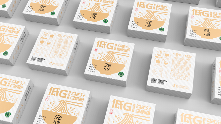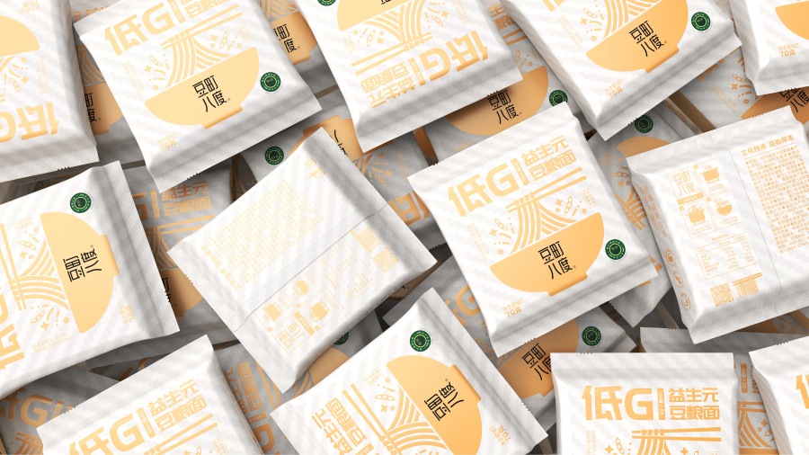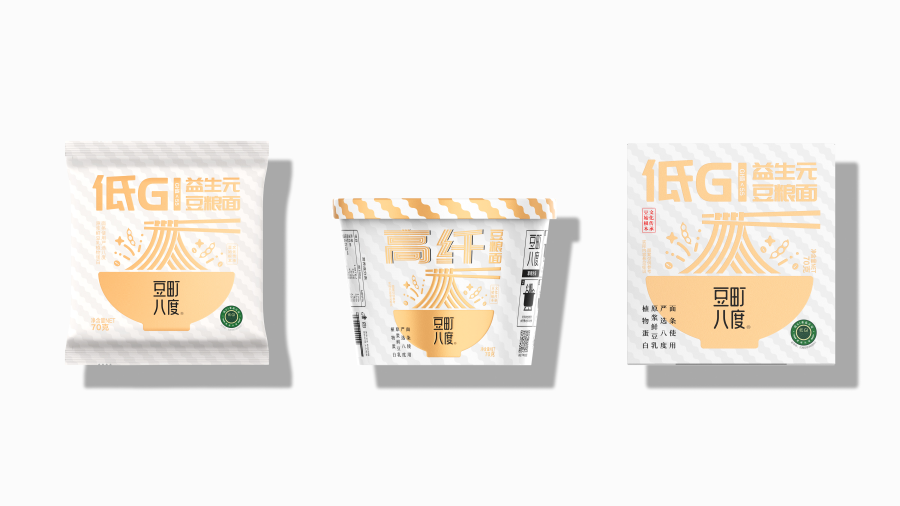 豆粮面系列包装设计从品牌入手,建立产品专属视觉图形。取豆町八度的“八”字与豆粮面相结合,形成独一无二的图形语言,宽线形态也是面条本身的外形。从产品入手,建立专属色彩:色彩来源于原材料大豆本身的颜色,给人健康、自然、生态的色彩感受。