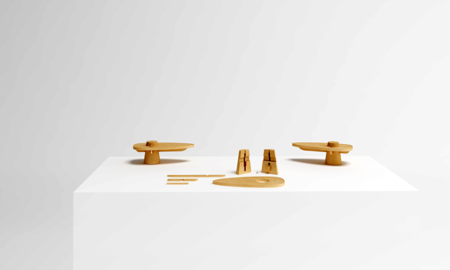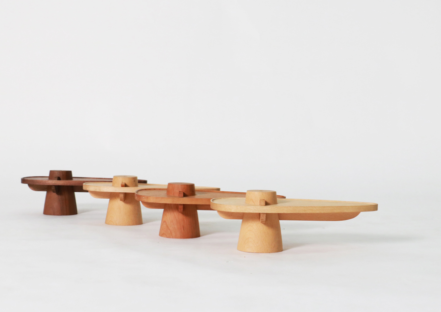 因为托盘伸出尺寸较长,重心不稳,因此在底座走马销的结构基础上增加了一个铅球来配重。铅球对走马销的结构可以产生自锁功能——只有将底座往一侧倾斜,铅球滑到走马销榫眼底部,才有空间让走马销的榫卯滑出,也增加了整体花器的趣味感。