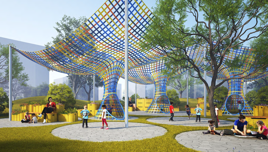 设计以“社区共建花园+儿童友好空间”为核心,围绕海洋文化主题,打造融合互动社区、文化艺术和生态可持续发展的景观节点。设计以“罾(zēng)”等捕鱼器具为灵感,编织出彩色的网状遮阳装置,孩子们可以在其中穿梭、游玩。在这片彩色网格下方是用鲜鱼周转筐改装的花池,每个村民可以在这里认领自己的专属花池,共同打造一个属于社区的花园。