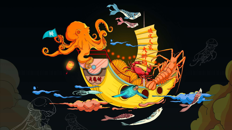 插画实际想要表达一种赶海归来的渔船游客觅食的场景。以渔船为核心装置,从船上蔓延出来小海鲜的灯火,一直延伸到菜市场渔市。