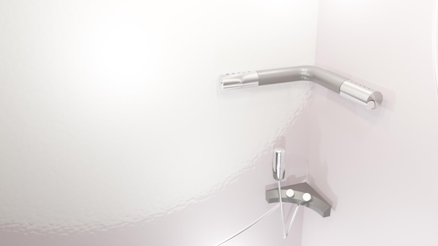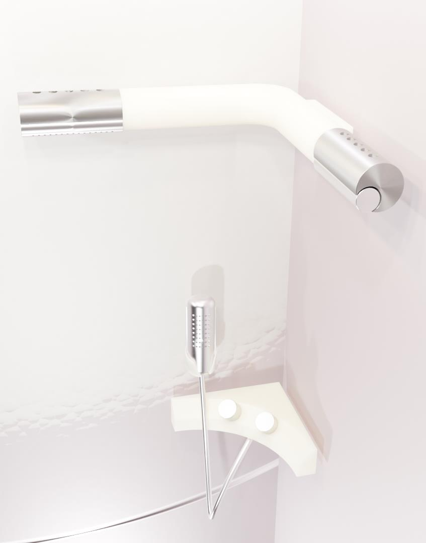 Corner of Blissful Moments 淋浴花洒旨在最大化利用转角空间,提升淋浴间的使用面积。设计避免水流直接从头顶淋下,降低使用者的不适感。双重水流设计提供不同的沐浴体验:水瀑模式可用于水疗,雨丝模式让水滴柔和地落在肌肤上。