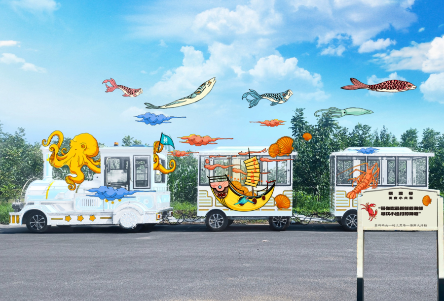 一个巨大的灯笼渔船,不断有小海鲜从舱中爬出。摆渡车上有专属的海鲜视觉与鱼风筝,小火车停在码头旁等待游客上车,车动,鱼风筝也飞舞。