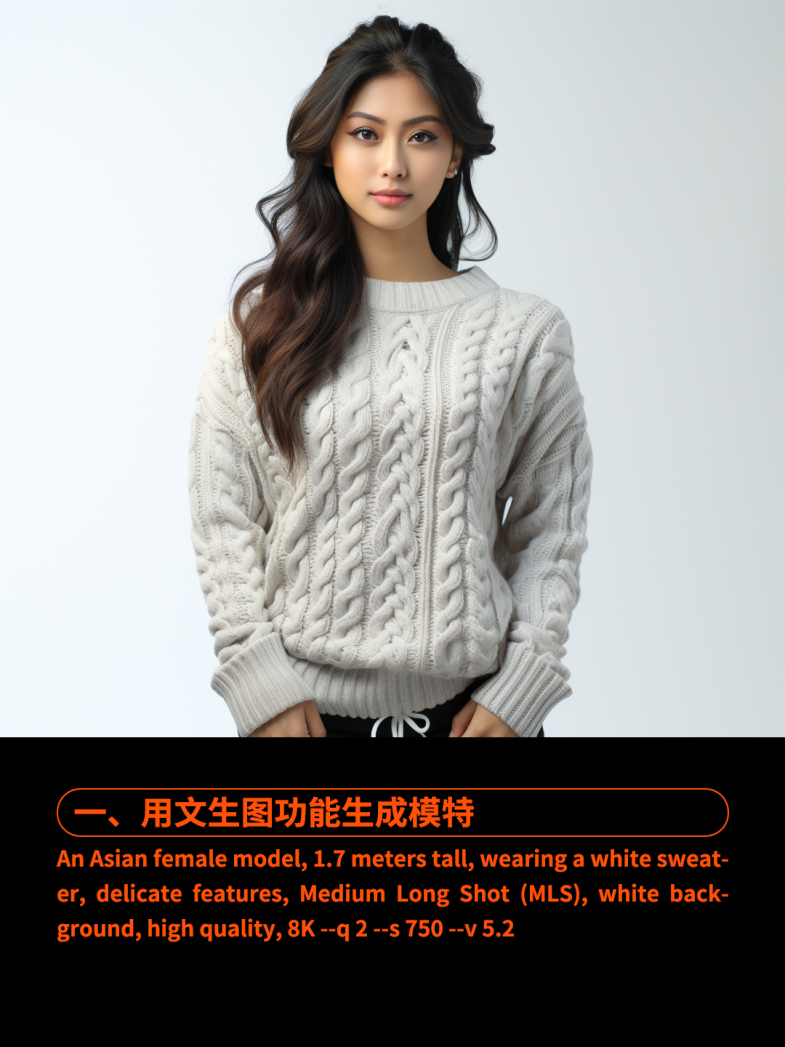 An Asian female model, 1.7 meters tall, wearing a white sweater, delicate features, Medium Shot, white background, high quality, 8K --q 2 --s 750 --v 5.2