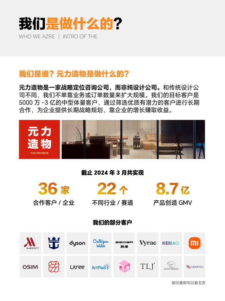 现如今,搬运,擦边式接单的营销号严重影响了行业的发展,生成式AI的出现也降低了甲方眼中设计师的价值感,优秀的原创设计师作品发布却鲜为人知,独立设计师只有抱团才能共赢。和传统设计公司不同,元力造物不是一家单靠设计业务支撑的公司,元力造物是一家战略咨询公司,为企业提供长期战略规划,我们靠筛选优秀的企业进行长期合作,靠企业增长来获得收益,同样我们也会筛选优秀的设计师进行合作,把客户的具体需求精准匹配给最擅长这个板块的设计师。