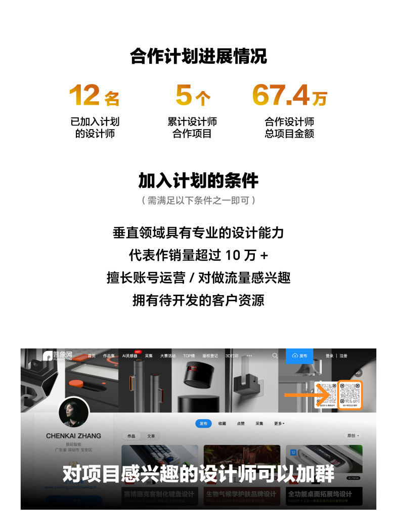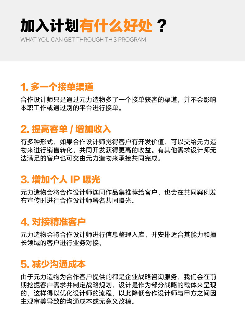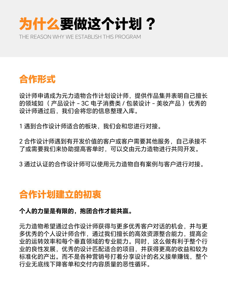 希望通过这个计划,对我们元力造物企业来说可以找到更多客户,并筛选长期合作伙伴,对于独立设计师来说可以匹配到精准的订单,提高客单,减少沟通成本等。