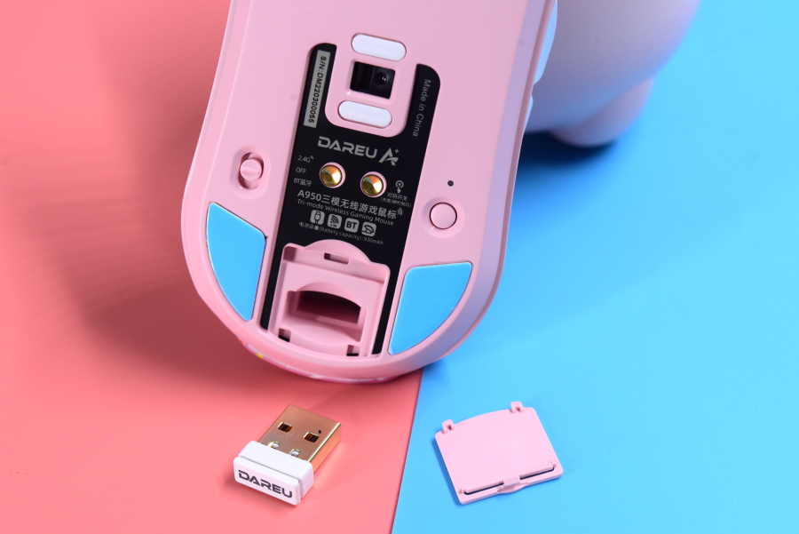 这里说了很久的三模就是:有线+2.4G+蓝牙。说实话,蓝牙的使用频率并不大,也许是厂家觉得反正都做了,啥连接模式都给你整上吧。光头上下的是白色脚贴(并不是按键),左边是3档连接模式切换推拨键,右边有一颗指示灯和蓝牙对码键。接收器的收纳仓在鼠标尾部,对手感影响不大。