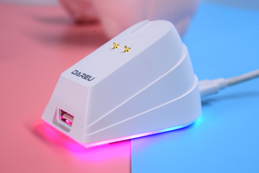 充电方面可以采用线充或者座充,如果可以像A900一样有快充功能那用起来将会更舒服。开箱后用座充充了大概1小时,充电时的灯带会闪烁,充满之后就会变成正常的RGB流动。