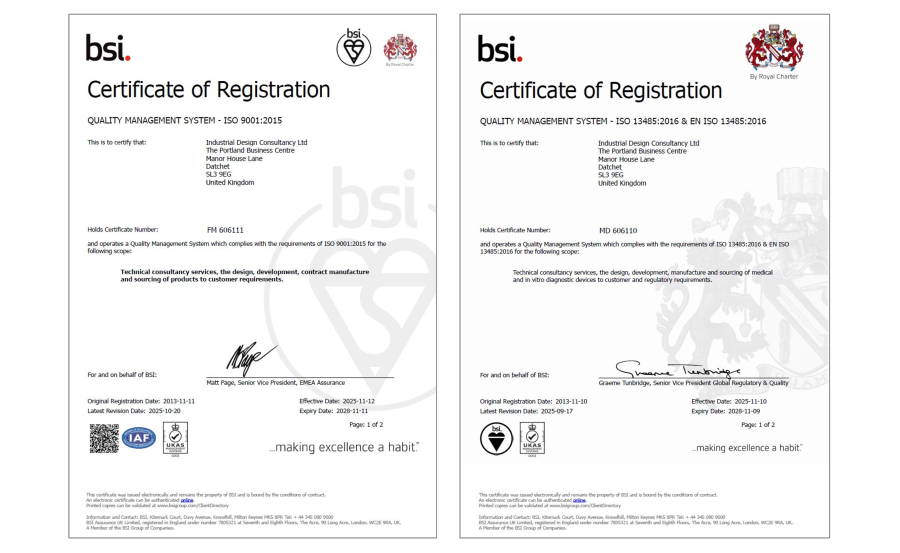 具备ISO9001及ISO13485质量体系资质,英国IDC以超过50年的产品创新丰富经验,及高达91%的设计成功转化为产品投入市场,保证我们的设计质量。