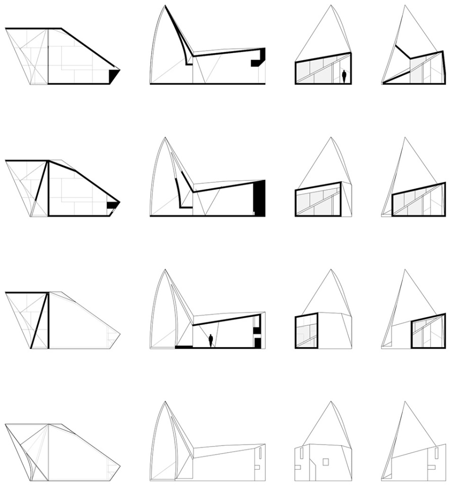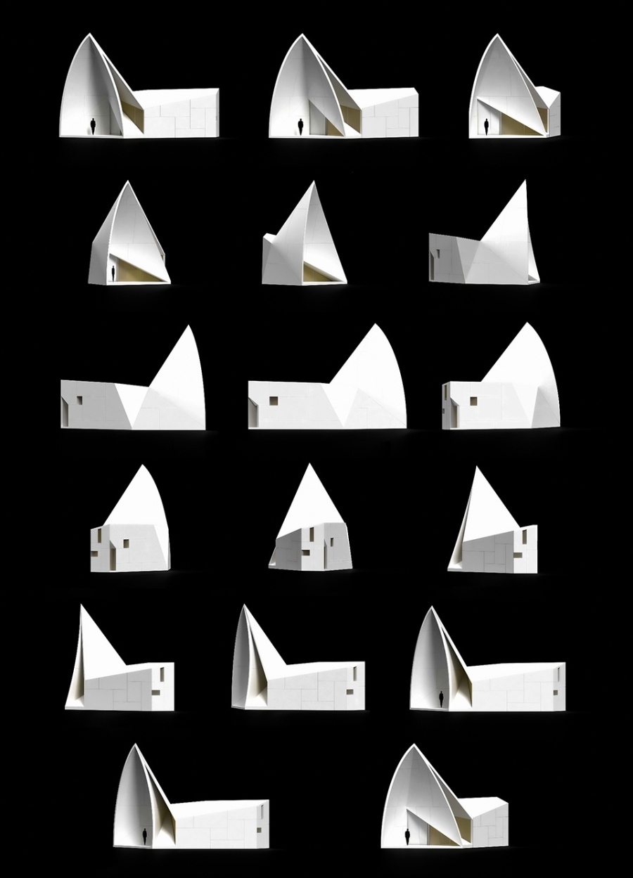 In this project the curved fold is a response to complex external stresses of a topological action. It is not an origami; it is a formal topological ex-pression – in structural equilibrium – that responds to these outer strains. It is conceived with an ample entrance, that welcomes, that leads toward a compressed end. A big hanging cross in concrete pierces the fold and creates light openings facing certain directions, casting different lights throughout the day, modifying the space inside bit by bit, continuously. The spatial experience is opposite of the one conveyed in the Chapel in Valleacerón.
