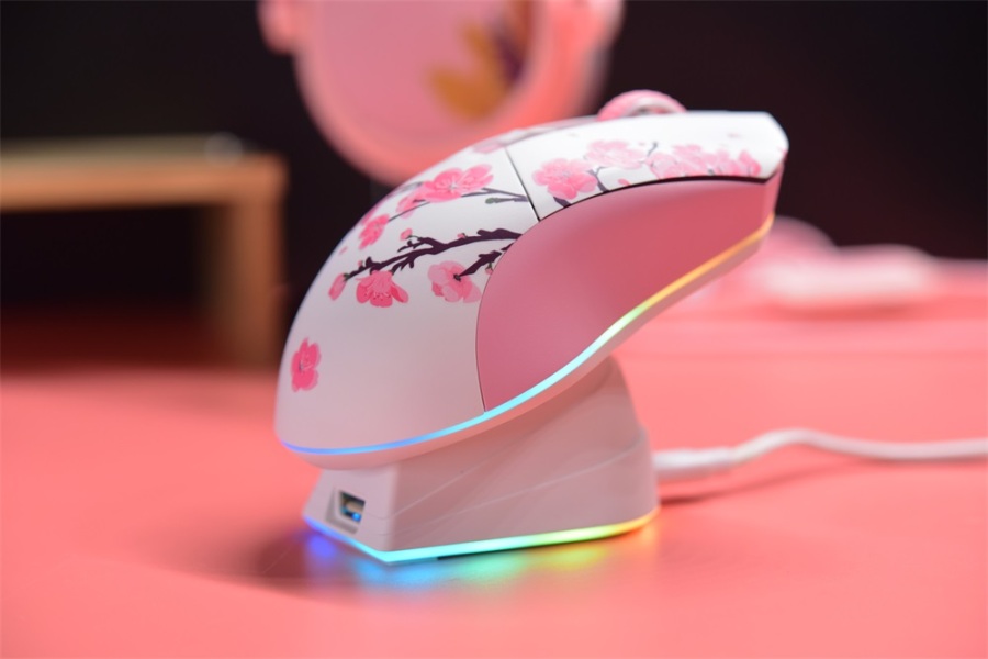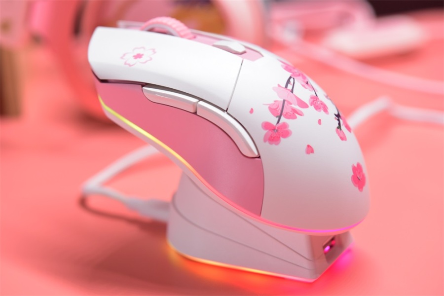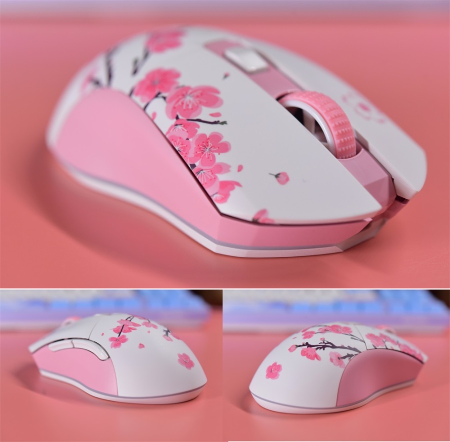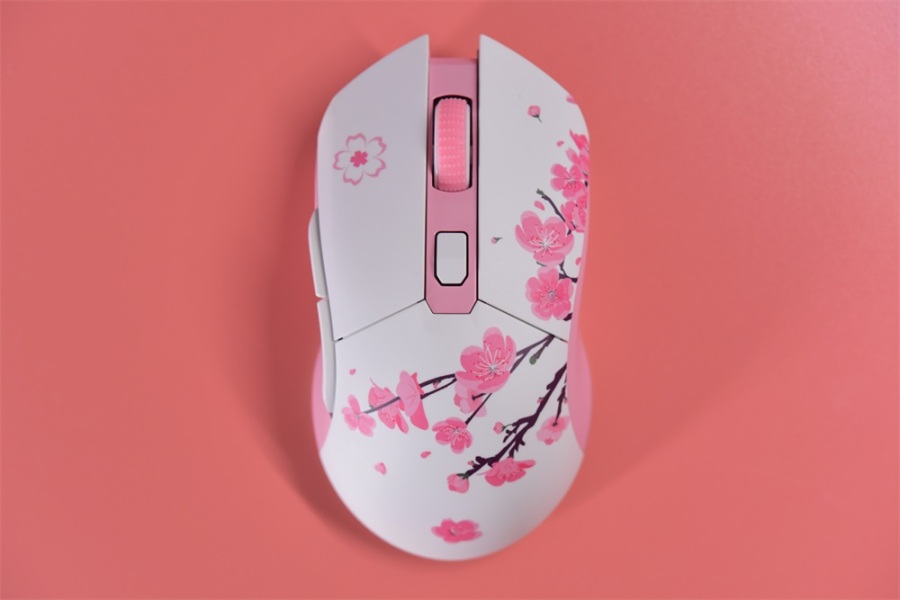 侧裙、滚轮都是粉色,因为是轻量化设计的原因,滚轮也是镂空塑料滚轮,整个鼠标只有85g,拿在手上的手感还是很轻,搭配无线就更舒服了。我们来康康这鼠标上的花,不得不说很细节。
