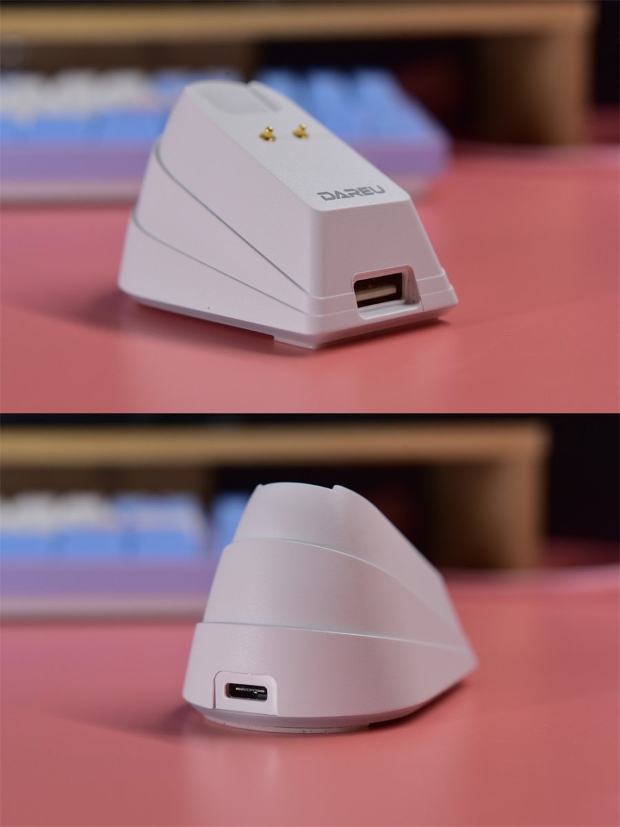 这个RGB炫彩充电座外形挺好看的,看着褶皱设计还以为是可以折叠的。这个充电座除了Type-C供电接口以外,还有一个USB接口,可以插接收器或者插其他杂七杂八的。
