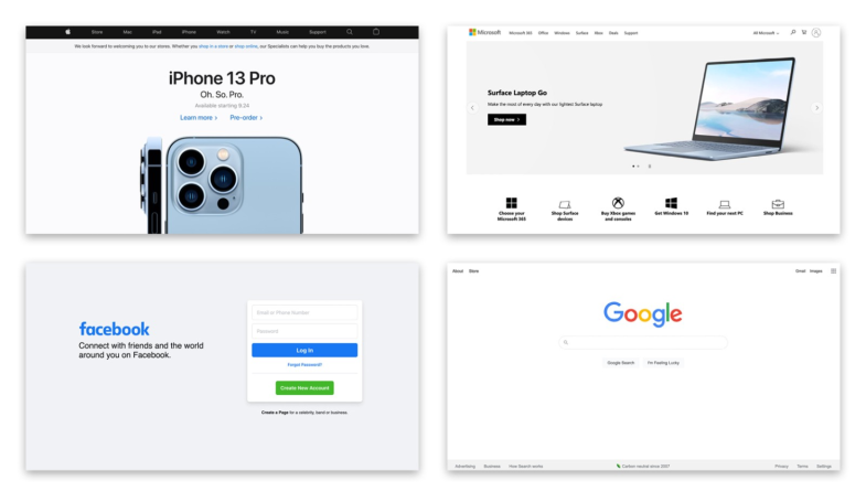 如果我们研究一下苹果、微软、脸书和谷歌等科技公司的网站,从美学角度来看,他们的设计都是中性、简洁的,干净的——为了可访问性,层次和导航而使用大量的留白和对比。