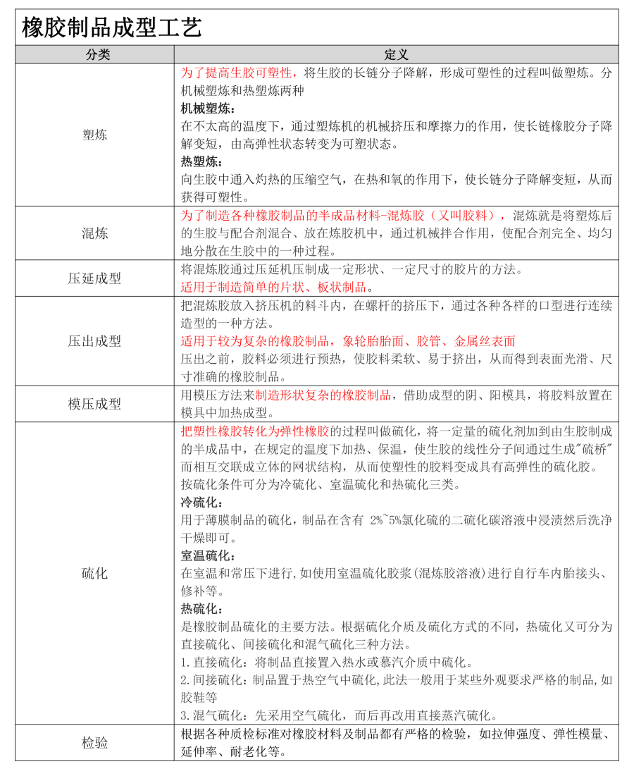 • 橡胶制品成型工艺流程:材料-塑炼-混炼-成型-硫化-修整-检验,具体如图: