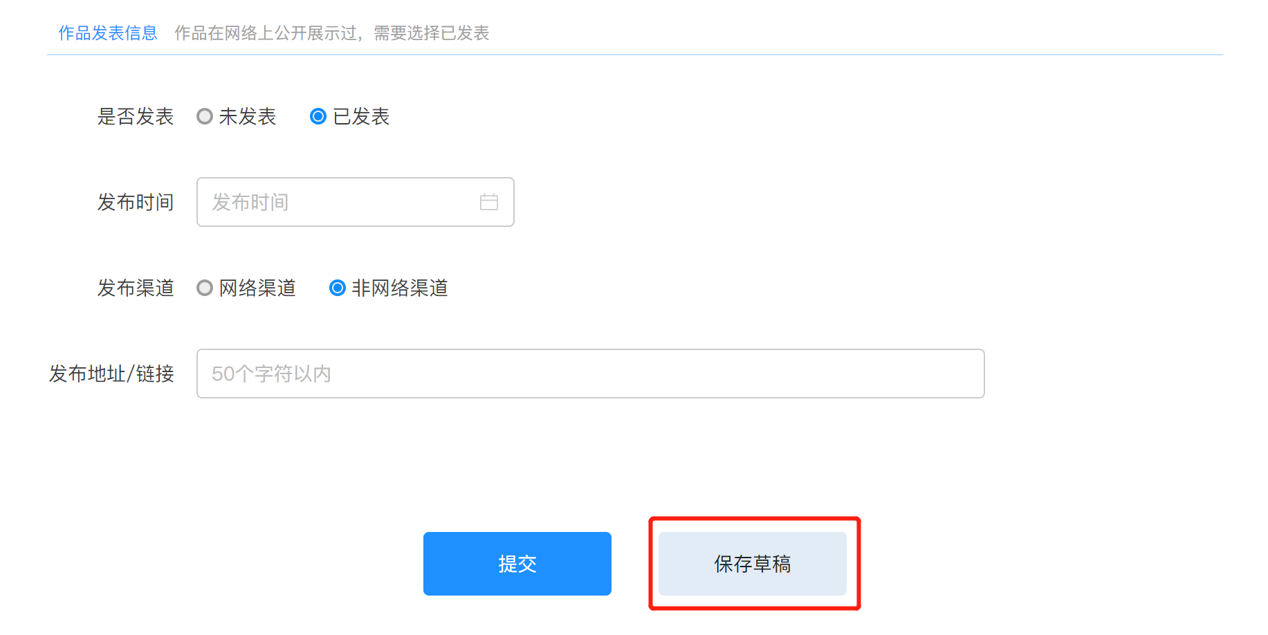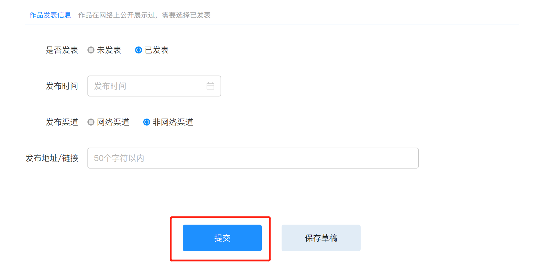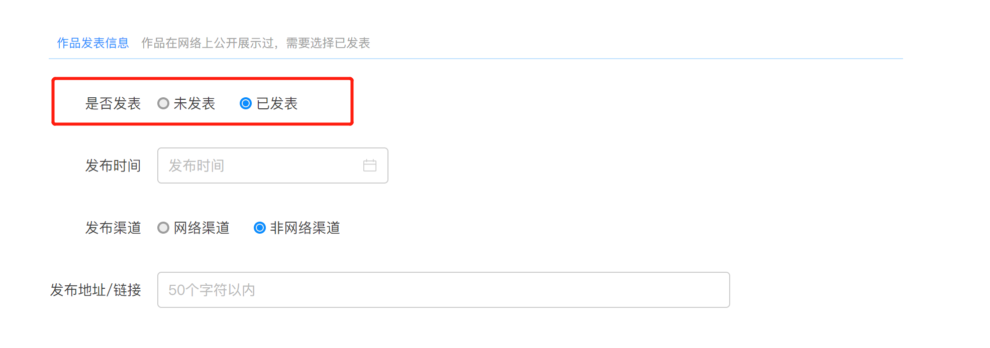 已发表:需要填写发布的时间、发布的渠道、发布地址/链接